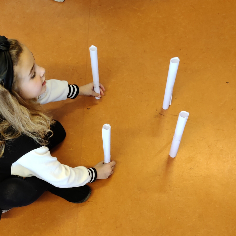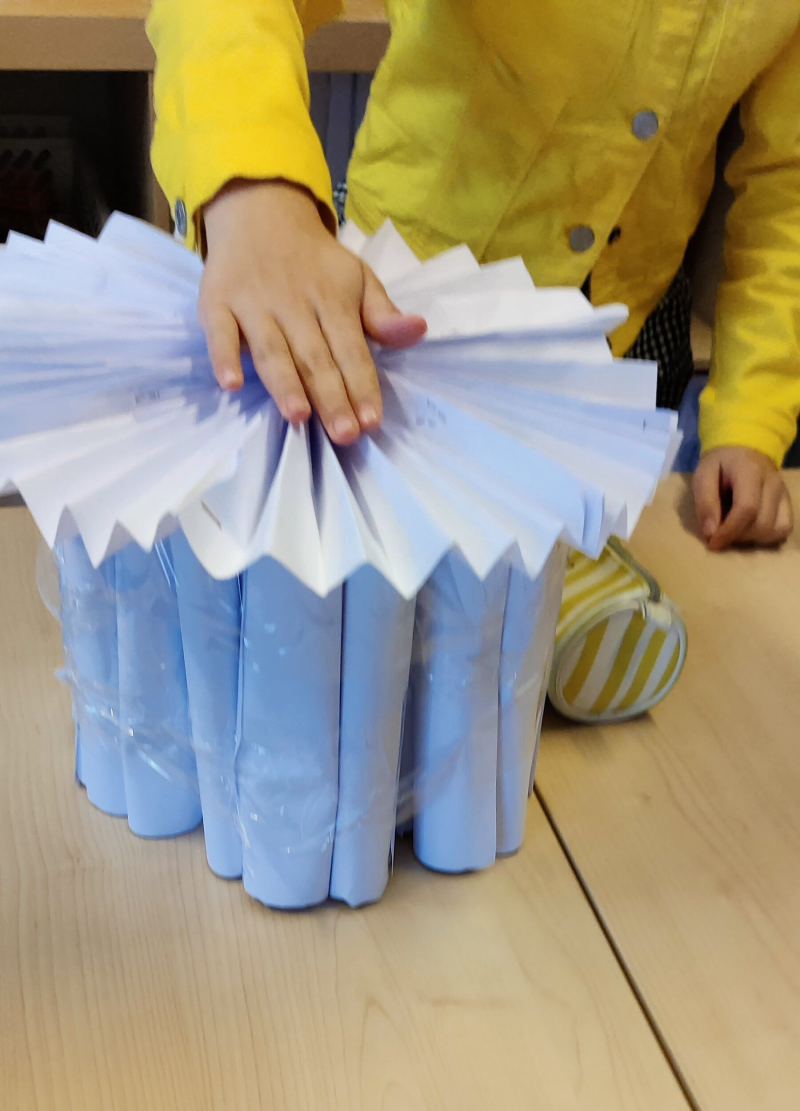 Tijdens het maken van de kruk was een van de groepen begonnen met de poten van de stoel. Voor de kinderen was het evident dat een rol papier als poot niet stevig genoeg zou zijn. Naast het papier mogen de kinderen ook gebruik maken van tape, nietmachines, scharen en plakband. De poot van de kruk werd voorzien van tape. Ondertussen was de poot van boven naar beneden met meerdere lagen rond getapet. Een van de kinderen gaf te kennen dat het papier veel te slap is. “Dus we hebben tape gebruikt om het stevig te maken.”